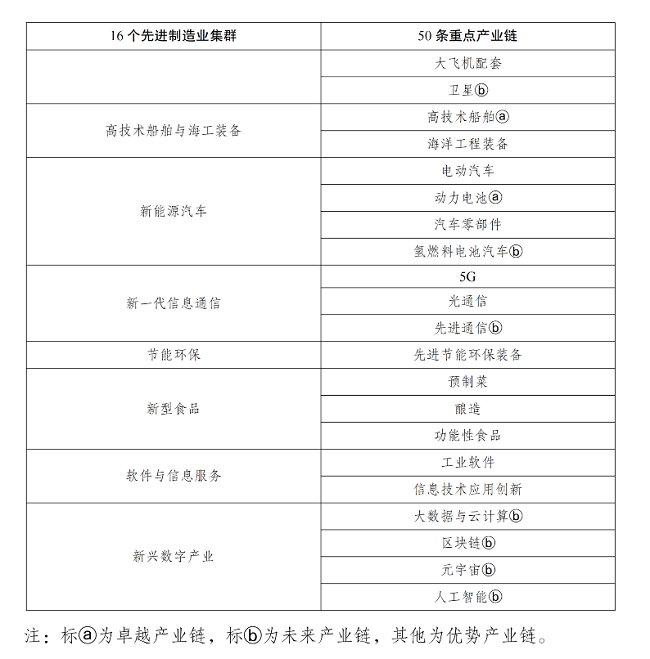 “1650”即16个先进制造业集群和50条重点产业链,分别为: