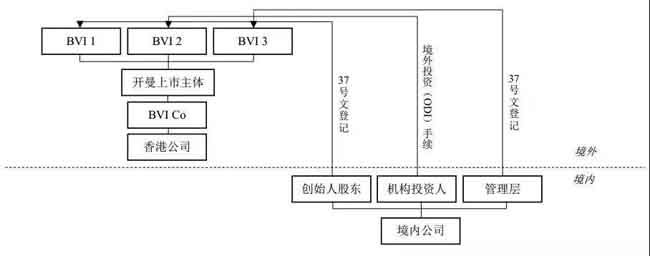 红筹模式:指公司注册在境外,通常在开曼或香港设立上市主体公司,适用当地法律和会计制度,但公司主要资产和业务均在我国大陆。红筹模式下的重组需要企业的股东通过适当的方式出境,在境外注册成立拟上市主体并搭建境外架构,并通过适当的途径将境内资产和业务注入境外架构。一般的红筹模式架构为: