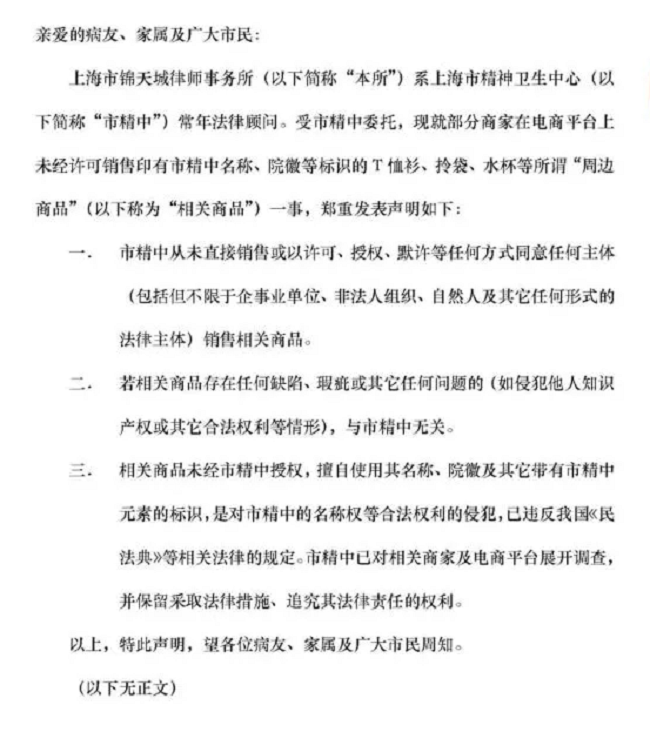 6月2日上海精神卫生中心就部分商家在电商平台上未经许可销售印有市精中名称、院徽等标识的T恤衫、拎袋、水杯等所谓“周边商品”发表声明,指出并未直接销售或者许可、授权、默认等任何方式同意任何主体销售相关商品,相关商品若存在任何问题与市精中无关,相关产品也侵犯了市精中的名称权,市精中保留追究其法律责任的权利。