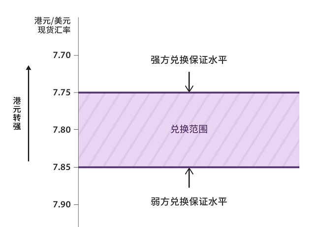 金管局提供兑换保证,承诺在7.75港元兑1美元的强方兑换保证水平,按银行要求卖出港元,并在7.85港元兑1美元的弱方兑换保证水平,按银行要求买入港元。