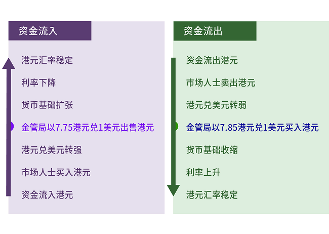 资金流出港元:若港元供过于求,令市场汇率转弱至7.85港元兑1美元的弱方兑换保证汇率,金管局随时准备向银行买入港元,使总结余(货币基础的一个组成部份)减少及推高港元利率,港元汇率随之由弱方兑换保证汇率水平回复至兑换范围内。