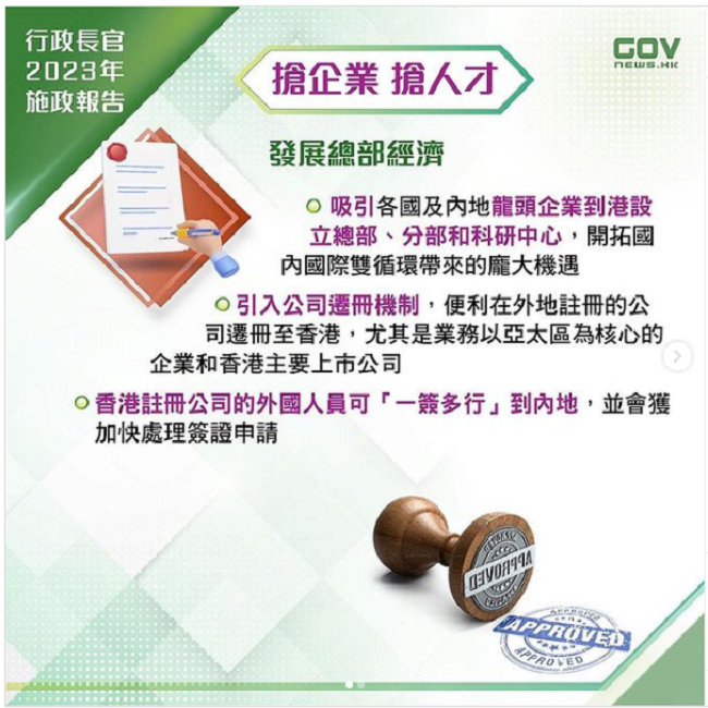 政府会引入公司迁册机制,便利在外地注册的公司,尤其以亚太区为业务核心的企业,将注册地迁至香港,目标是明年上半年提交立法建议。投资推广署和香港交易及结算所有限公司(港交所)会主动接触在外地注册的香港主要上市公司,鼓励它们迁册到香港。