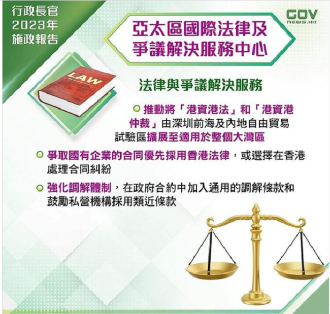 政府继续建设香港成为亚太区国际法律及争议解决服务中心,措施包括: