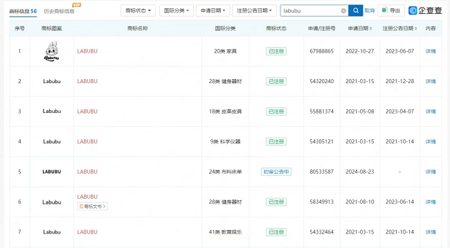 不仅商标数量多,在商标布局上,泡泡玛特对每个IP 都进行了全方位的商标注册,比如近期爆火的“labubu”,不仅注册了核心的第28 类玩具商标,和其他相关类别上的防御性注册,如第16 类文具、第35 类广告销售、第41类教育娱乐等,甚至连文字和图片都进行了全品类商标注册,这也在一定程度上杜绝了其他主体蹭名牌的可能。