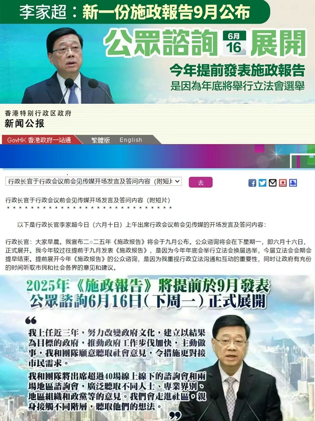 2025年6月10日,香港特首李家超宣布,2025年《施政报告》将提前至9月发布,公众咨询于6月16日启动。这一调整直接关联年底立法会换届选举,旨在加强行政立法互动,同时为政策制定预留更充分的时间。