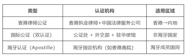 认证方式:香港律师公证 + 中国法律服务(香港)有限公司加章